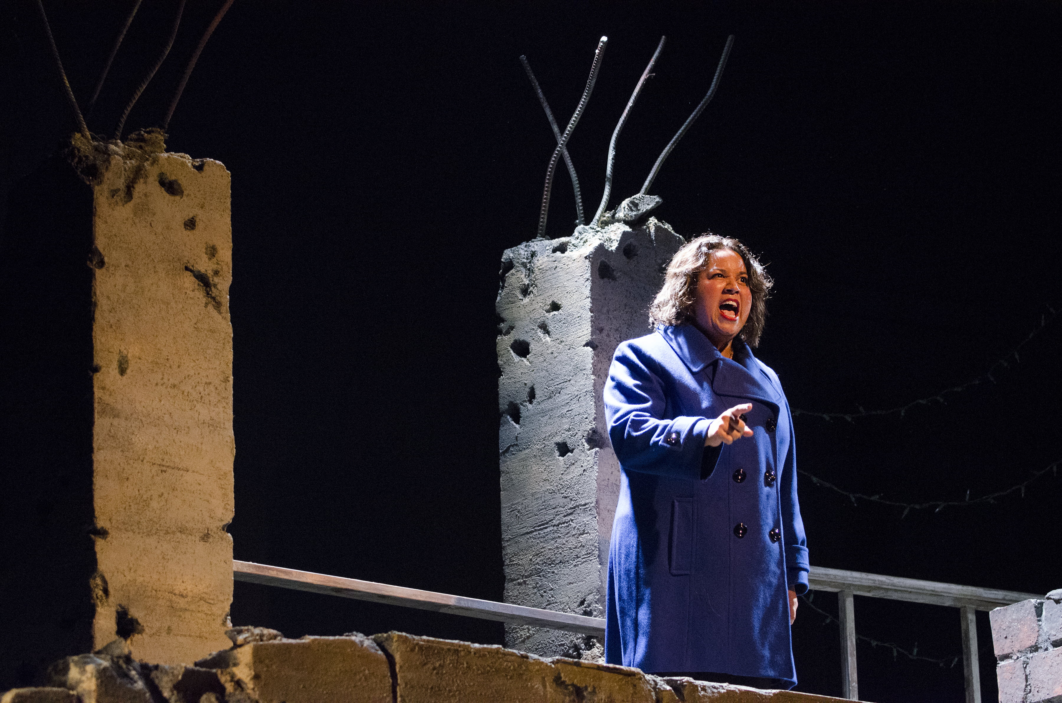 Two of the characters, Elliot and Yaz, had established looks from previous plays in the cycle. For Yaz (played by GerRee Hinshaw), Kevin leaned on her love of jazz, formerly sophisticated lifestyle, and vibrant personality to select her look. At home, Yaz is comfortable, but when she is out in the community, Kevin felt she would select “visually arresting statement pieces.” Her cobalt blue coat for her impassioned call for protest, for example. In the summer, like in Water by the Spoonful, Yaz wears more patterns and prints, but year-round she reaches for bold colors.